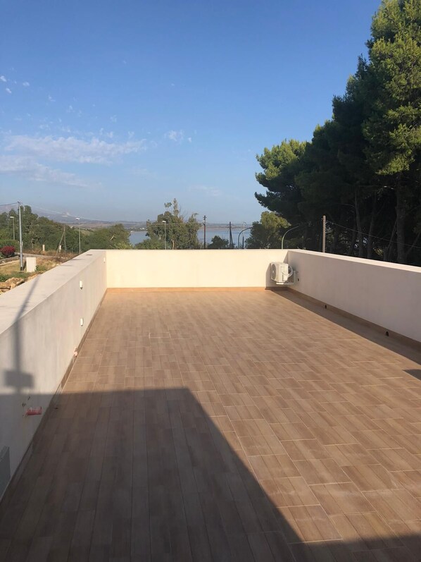 La casa è composta da due camere da letto (una matrimoniale e una doppia con letto a castello), bagno con doccia, disimpegno attrezzato, corridoio, cucina abitabile corredata di divano e con veduta panoramica, terrazzo con copertura in legno, terrazza solarium attrezzata da lettini e area relax, ampio spazio esterno lastricato ombreggiato anche da un grande ombrellone e possibilità di approfittare del barbecue per serate all'aperto.