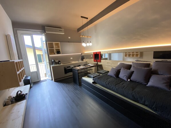 The apartment includes a kitchenette and an oven. A flat-screen TV is available.