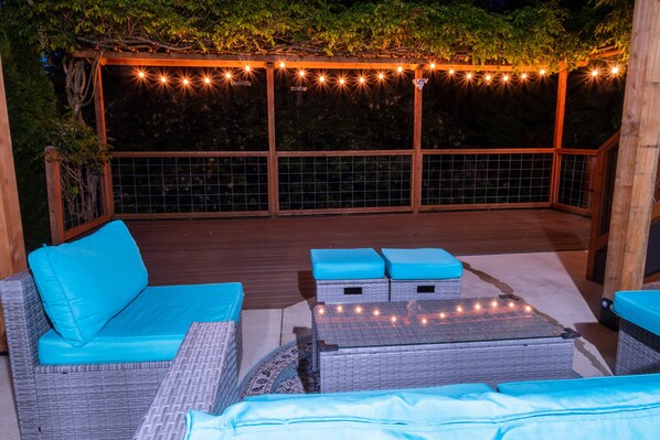Escape to a cozy retreat at this entire place. Unwind in the living room with a 4-seater power recliner, TV with Roku, and gas fireplace. Get some work done in the separate office room or enjoy quality time playing ping-pong or piano.