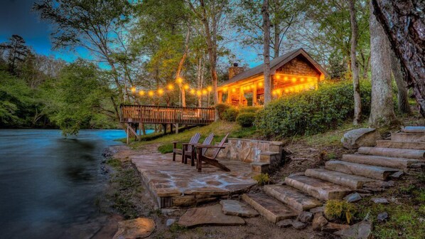 The outdoor living areas at Hooked on Toccoa take full advantage of the riverfront, just steps from the back door. French doors off the main living area open to an enormous screened-in porch with a dining table on one side and a cozy sitting area with flat-screen TV on the other. Step outside the porch and you can cross over a gently curved walkway directly down to the gently sloped riverbank or gather under the covered pavilion with wood-burning stone fireplace, Adirondack chairs, gas grill and picnic table for dining al fresco. The pavilion leads to a large wooden deck perched above the river, ideal for fishing for award-winning trout.