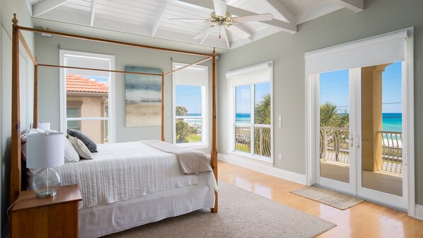 Conveniently located downstairs is a delightful guest bedroom with a king bed and an adjacent full bathroom and closet. The upstairs master bedroom suite is a luxurious retreat. With a whitewashed cathedral ceiling atop a stacked stone fireplace and sitting area, the master bedroom offers a four poster king bed along with a wet bar and access to the beachfront balcony. The master bathroom is designed in clean white finishes, and features an oversize shower, a double basin vanity, and a jetted bathtub.