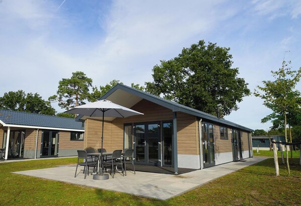 The spacious chalet Velthorst 6 is detached and has an attractive and contemporary interior. It is on the ground floor and suitable for 6 people. Some chalets can be entered via a few steps. The living room has a nice sitting area with television, a dining area and a spacious kitchen, which is equipped with a dishwasher, filter coffee maker and a combination microwave. Velthorst 6 has 3 bedrooms, 2 with 2 single beds and 1 with a bunk bed. The bathroom has a shower, toilet and sink. In the garden you have a terrace with garden furniture. You can park 1 car at the chalet and free Wi-Fi is available.
