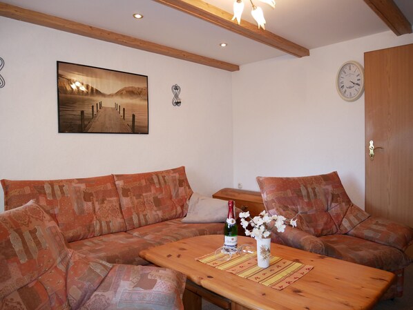 The 46 square meter apartment has a dining room (dining table with 4 chairs), a living room with sitting area (the pull-out couch offers an extra bed for 2 persons) and TV. The separate kitchen is equipped with 4-burner stove, oven, kettle, toaster etc. The bedroom has a double bed, a single bed and a wardrobe. The adjoining bathroom is equipped with shower / WC. A seating area is located directly in front of the object, you can also lay it in the garden of the landlord, a barbecue is also provided.