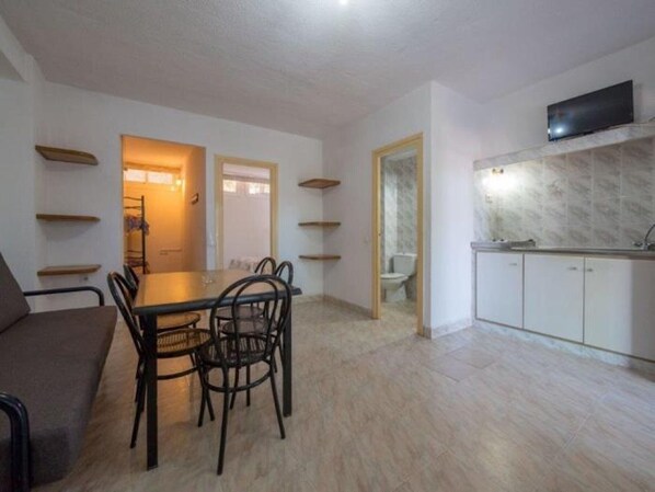 - It has: living-room-dining room with single bench-bed, kitchenette, 1 double bedroom, bathroom and small terrace.