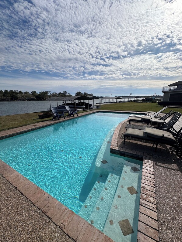 Lovely two-story true waterfront home tastefully decorated - sure to delight any traveler. Lake house is in the popular Walden Golf Course Community close to the Walden Yacht Club and many Wedding Venues in the area. Nearby entertainment off Hwy 105, restaurants, boat launch and shops. Beautiful waterfront home with A WONDERFUL FIRE PIT FOR ROASTING MARSHMALLOWS BY THE LAKE... magnificent views from all windows across the back, two master suites with romantic lake views from private balconies. Sit around our large patio to BBQ or relax and enjoy the awesome views whether inside or outside!!. Sparkling Pool for endless entertaining. Some floats provided for great family fun in the pool or lake. The pool has built-in seating around the edge. !!Excellent home for a family vacation or to gather with friends and make new memories or just sit back, relax and read a good book or magazine sitting outside or sitting in the comfort of our sofas from the inside looking out! Have fun fishing right outside the back DOCK, be sure to pick up worms at the Country store a couple of blocks near the home. The Fishing is fun and entertaining for everyone of all ages. BRING YOUR BOAT!!