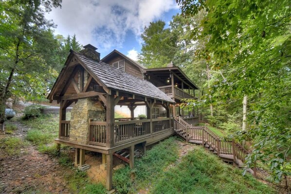 This dog friendly cabin rental is perfect for families and groups of friends! Whether you're hanging out on porches and grilling, or relaxing in the hot tub or by the fire pit, cozying up next to the indoor/outdoor fireplaces, or enjoying the floor plan with your doggo, the beautiful nature surroundings offer the perfect backdrop to your relaxing getaway in the mountains!