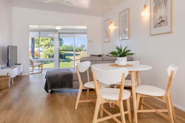 The accommodation includes open plan comfortable living areas, fully equipped kitchen, three well-appointed bedrooms: two featuring comfortable Queen beds for adults, and a third bedroom designed specifically for children, equipped with another Queen bed and a sofa bed. For indoor entertainment, this room also comes with a smart TV to keep the kids entertained, especially if you encounter any inclement weather during your stay.