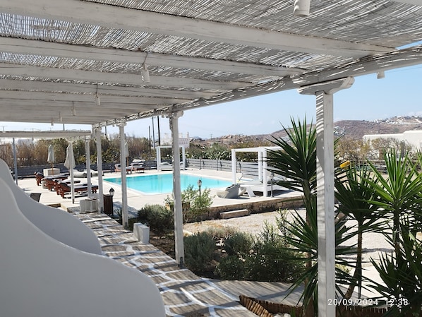 Nikos rooms near Mykonos Old Port offers a genuine island experience. Guests can relax on sun loungers by the pool, wander through the scenic garden, or unwind on the terrace. Each room includes WiFi, ensuring you stay connected while enjoying Greek hospitality.