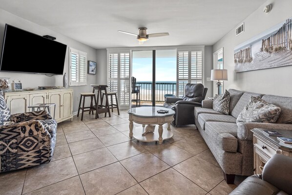 Inside, the condo features bright open living spaces designed for relaxation after sun-filled days at the beach. The comfortable living area includes a 65-inch TV, plush seating, and sweeping oceanfront views, while the fully equipped kitchen features modern appliances, granite countertops, and a Keurig coffee maker. The dining area provides seating for eight, making it easy to gather for meals or game nights.