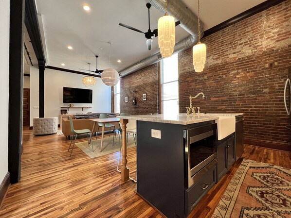 75” tv in main room, 55” tvs in both bedrooms. Extra large kitchen island with skyscraper pendant lights. Curated Outlaw Country record collection.