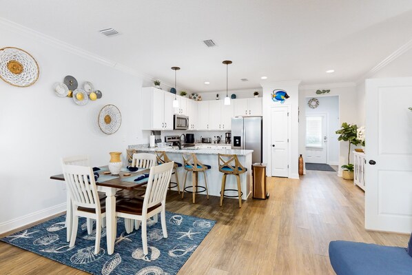 Step through the front door of your home and into a sparkling, catalog-worthy interior adorned in seaside colors and decor. The well-equipped, full kitchen stands ready to help you whip up mealtime masterpieces with a full suite of stainless steel appliances and a breakfast bar with counter seating. Gather for more formal meals at the adjacent table or head out to the patio for an intimate alfresco experience. After dining, take a seat on the matching sofas in the living area and watch TV into the evening. Don't forget the popcorn!