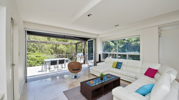 The Apartment - Stylishly appointed throughout, this three bedroom air conditioned apartment provides easy indoor/outdoor living with bi-fold doors that open the main living area to the spacious deck, which overlooks bushland reserve offering an outdoor setting, gas BBQ and filtered water views to the headlands. The tiled living area offers a lovely leather corner lounge, large flat screen smart TV, DVD player, i-pod dock, split system air conditioner (heating + cooling) and WiFi. The modern kitchen comes with stainless steel appliances including a double door fridge/freezer, microwave, dishwasher, oven, glass stove-top and plenty of bench space to prepare meals or platters.