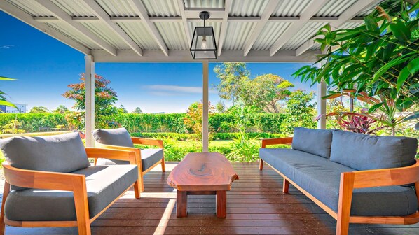The House - A quality interior designed renovation and refurbishment has been undertaken to deliver a holiday house packed with features. A large open plan living and dining area with flat screen Smart TV, a gourmet kitchen with dishwasher, microwave, oven and cooktop and a rear landscaped entertaining area with a gas BBQ and magnificent gardens. Upstairs there are three bedrooms with King Size beds, air conditioning and ceiling fans, a study, a main bathroom with shower and freestanding tub, ensuite and a separate powder room, plus an internal laundry with washer and dryer. Beach towels provided for guest convenience.