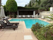 Travelers find La Grande Bastide perfectly positioned near Fondation Maeght. The serene garden offers a peaceful retreat, and the spa tub provides relaxation after sightseeing. Sun loungers surround the outdoor pool, with historic Château Grimaldi nearby.