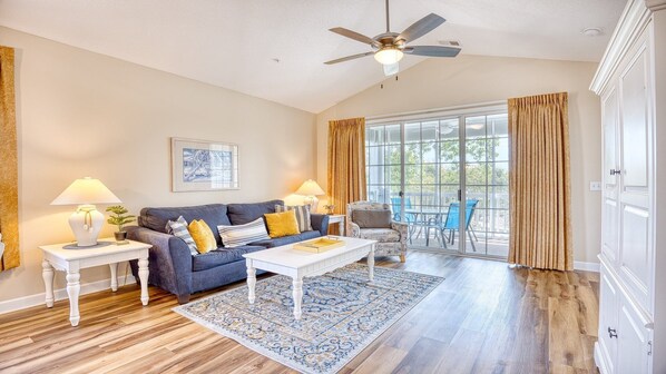 Escape to the beautiful Ironwood unit at Barefoot Resort, perfectly situated for a Myrtle Beach getaway. The cozy kitchen is equipped with exciting cookware, while the spacious living area features a sleep sofa and entertainment center with flat screen TV. Enjoy your private covered lanai or visit the main resort pool on the waterway and take advantage of our seasonal shuttle to get across to oceanfront just three blocks from Barefoot Landing.