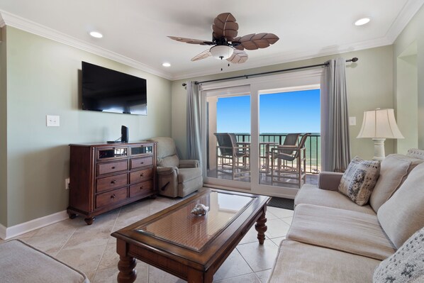 Step into a bright, beachy living room designed for total comfort and relaxation. Kick back on the plush sofas, catch a movie on the large smart TV, or slide open the glass doors and soak in the stunning ocean views right from your seat. Coastal accents, tile floors, and a tropical ceiling fan complete the airy vibe, while the open layout keeps you connected to the kitchen and dining area.