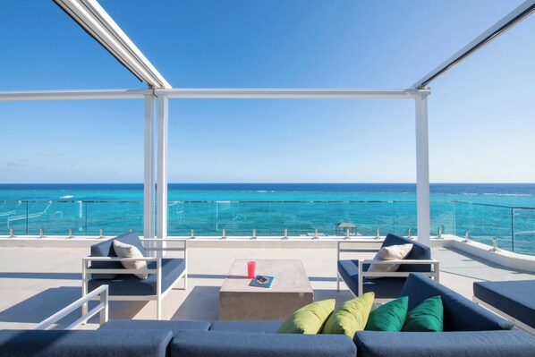 Walk out from the living area onto the private open-air balcony overlooking the resort's pool deck and beachfront. The balcony stretches the full width of the home providing ample outdoor living space. Furnished with an alfresco dining table, outdoor lounge seating, and sun loungers you will love the sky-high panoramic views. The balcony is also equipped with a retractable sunshade above an aluminum pergola providing relief from the island sun.