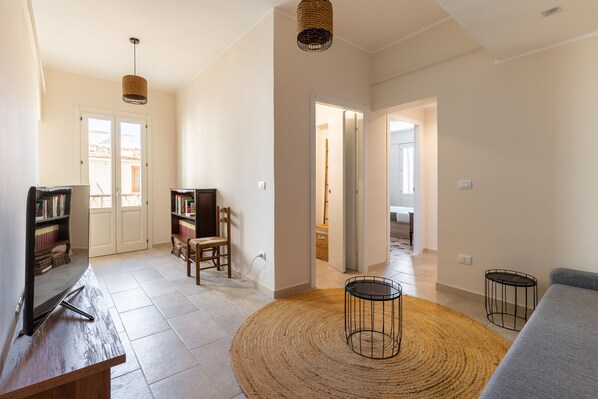 The accommodation opens onto a private space with no rooms; from here there is access to the second floor where there is a small sitting room furnished with a TV and sofa. Next are two bedrooms, both with a queen-size bed each, and a bathroom with shower.