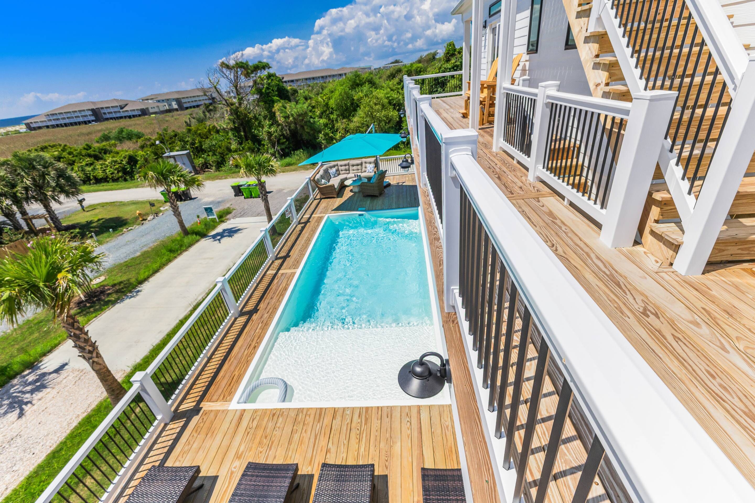 - Elevated in-deck oceanfront private saltwater swimming pool (12 x 26) with views all around on the ocean side of the home