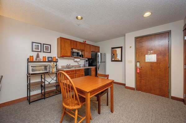 This One Bedroom Suite is ideal for a romantic getaway or a small family vacation. Offering the privacy of a luxurious king bed in a separate bedroom from the living area and kitchenette, guests can enjoy their own private sleeping area. There is also a large slider off the living area to your private oversized deck and chairs. The unit includes a separate bedroom with a large closet and dresser. A queen-size sleeper sofa is in the main living area and includes a high-quality mattress for maximum comfort and a gas fireplace to complete the relaxation theme.