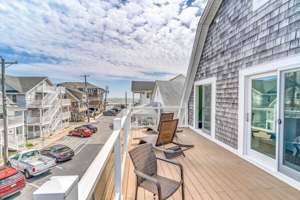 Downtown Ocean City's 8th street is home to this ocean-side retreat. Enjoy short strolls to the beach and boardwalk, spacious living areas, and balcony/patio spaces across three stories. Relax in one of two living rooms with large smart TVs or unwind with a meal in the adjacent dining room.