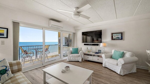 Just Completely Renovated this Cozy 1 bed, 1.5 bath Oceanfront condo, is a special place to spend relaxing time at the beach. Unit has all you need for a great stay with all new appliances, new furniture, of course a large screen smart TV in the living room and bedroom. Specifics are granite countertops with eat-in bar top, large dining or work table, frameless glass tub enclosure, just replaced full sized washer and dryer, new queen sleep sofa in living room. Master bedroom has a half bath, with 2 full beds. Unit rents partial weeks to vacation travelers June through August. Flex schedule the rest of the year. Free Wi-Fi and Xfinity cable service. Cable box for living room TV only. Smart TV streaming in the bedroom. Sandpiper Dunes Building features an outdoor pool and is located right on the beach. No smoking or pets allowed. Max occupancy 4.