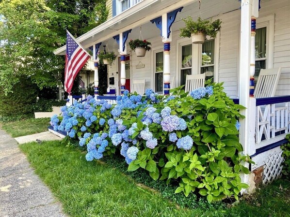 We fell in love with this house mostly because of its large outdoor space which, coming from the city, we really coveted! There are not many homes in town with this much private outdoor space and there's nothing lovelier than sitting out back in the garden, sipping an iced tea and just...relaxing. The house itself also has lovely features such as beautiful wide plank hardwood floors, a Juliet porch off the front bedroom and a full front porch with rockers - perfect for watching the world go by...