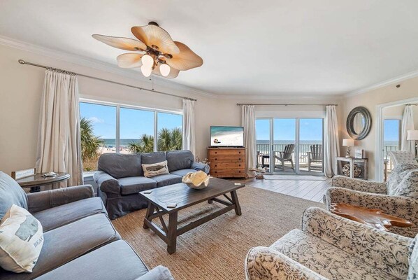 Living Room: Two cozy sofas, including a queen sleeper, flat-screen TV, and direct access to the Gulf-view balcony.