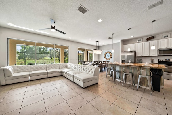 In the living room, you'll find a mounted 86” flat-screen television, ideal for movie nights. On pleasant days, open the sliding doors to let in the fresh air and step outside to enjoy your private pool, complete with loungers for soaking up the Florida sunshine.