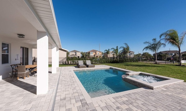 The outdoor living space is perfect for warm Florida summer days with a private swimming pool and spillover spa, ample lounge chairs, and a dining table for the entire family to enjoy.