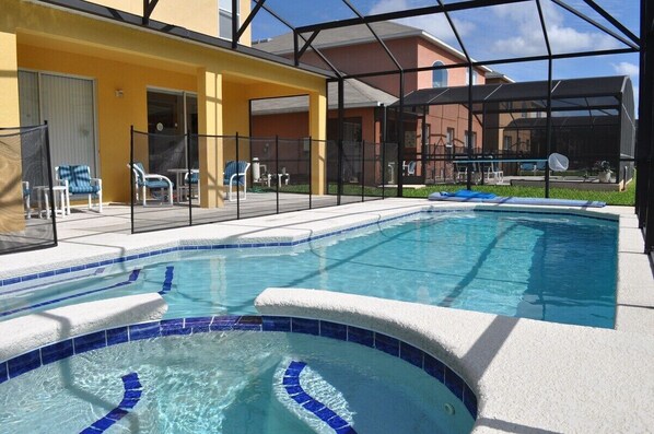 Further details outdoors:: You could step into 15 x 30 foot crystal clear water of the heated pool or really relax in the Jacuzzi or just lie back on one of our comfortable lounger. The pool and lanai are south facing which give you sun all day long. There is an extended lanai, 8ft which is to provide shade and comfort for you from the strong heat of Floridian sun. On the extended deck there is plenty of space for the kids to play and for a table and chairs so you can have a snack and cold drink. Choose to let your worries float away whilst unwinding in the spa or sprawl across one of many comfy deckchairs with a book and get a gorgeous tan. The pool offers a removable safety fence which is ideal for the younger ones and all doors leading to the pool have safety locks and alarms; another useful feature of the villa. Both the sparkling pool and bubbling raised spa can be heated. At night why not switch on the underwater pool lights to create a serene, magical atmosphere, No problem.