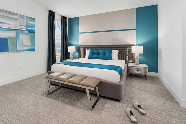 Just wait until you see the five fabulous sanctuaries awaiting your crew after action-packed days in Orlando—two on the main floor and three more upstairs. Each room features chic design touches, super comfy beds, flat-screen TVs, luxe en-suite bathrooms, and thoughtful amenities. Unique decorative wall panels lend aesthetic flair, while soothing hues (think blues, greens, and natural tones) set a calm mood for a perfect night’s rest.