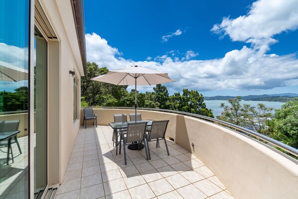 From your elevated position, pour yourself a cold beverage on a hot day and unwind on the expansive balcony while you enjoy panoramic sea views.