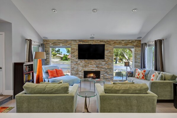 Southern Exposure Retreat is one of our most popular Palm Desert properties just got even better! Walking distance to high end shops and popular restaurants on El Paseo, and close proximity to museums, countless golf courses and “The Living Desert” zoo, this completely remodeled and newly furnished 4 bedroom 3 bathroom home is brand new inside and out. The Great room is ideal for entertaining or relaxing, is large enough to seat everyone staying at the house, and features vaulted ceilings, and an open living room with fireplace. The kitchen and dining area open to a large patio and a sparkling blue swimming pool, with optional fence for child safety. The completely private backyard with Southern exposure and mountain and palm tree views, will allow you to feel comfortable, as if you are in a world of your own, yet the newly installed desert-friendly Xeriscape will connect you with your surroundings. The dual Master bedrooms each feature a King size bed and private en-suite bathrooms, and the two additional Guest bedrooms each offer a Queen size bed. There is great separation of bedrooms in the home for added privacy, and each bedroom features flat screen televisions for your viewing pleasure. No cats are allowed.