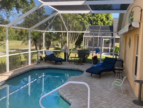 This home is a 4 bedroom 2 full baths and a half bath which happens to be on the lanai, how nice is that for those wet feet and wet suits. You can relax around the pool in the chaise loungers with the view of the 15th fairway and the pond or sit at the table with your favorite beverage watching the outdoor TV.