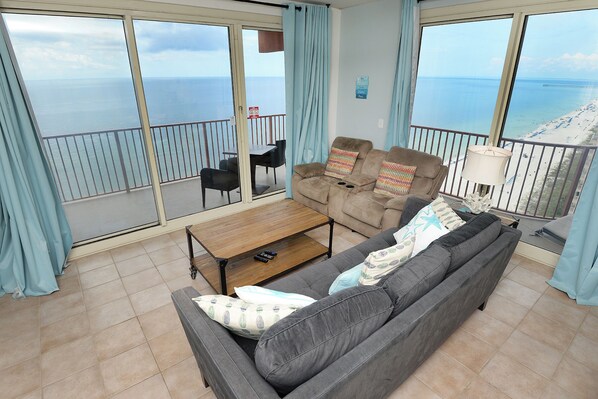 You will enjoy amazing decor and upgrades throughout. You will find the most comfortable living space a vacation property can offer. This unit has a full-size kitchen including all modern appliances, cookware and utensils for an at home convenience. The living room has a sofa bed, flat screen tv and amazing views of the Gulf of Mexico. You also have 1 reserved parking space. Additional parking can be found in any unreserved spot. We look forward to having you as our guest.