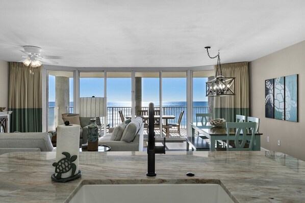 The warm Florida sun and cool ocean breezes await you at this stunning third floor condo at Long Beach Resort,and it's located in tower 3, the closest tower to the lagoon pool! This condo features wall to wall oceanfront views from every room of this spacious 1400 sq. ft retreat, and with the location of this resort, it is convenient to everything from the great restaurants to a Super Walmart right across the street! Large lagoon pool (6800 sq. ft) with waterfalls, whirlpool spas, two Polynesian pools (heated seasonally), onsite bar and grill(seasonal), beautifully landscaped grounds, on site jet ski/umbrella chair rentals as well as 24 hour gated access and security. The living room has a 65-inch flat screen TV, and new sofa, loveseat and comfy sitting chair. There is a King size bed in the master suite with 55"TV and two queen beds in the guest bedroom with a 55" TV. No "motel grade" linens in this condo, all beds have new mattresses with premium linens! Each bedroom has its own private bath with double granite vanities and stunning walk in showers. Step out onto your huge private balcony from both bedrooms and living room area to enjoy the soothing sounds of the gulf or to watch a gorgeous Florida sunset! This unit also has a full glass storm door so that you can leave your front door open and bring in even more sunlight! Your balcony overlooks 1300 feet of private, white sandy beach with onsite jet ski & umbrella/chair rentals. This is a NON SMOKING unit, Pets NOT allowed, and renter must be 25 or older and occupy the unit during the entire rental term.