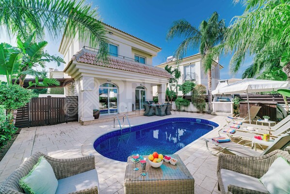 Step outside onto the spacious veranda, where you'll find an outdoor table and chairs for six people. This is an ideal spot for al fresco dining or simply enjoying a morning coffee while soaking in the tranquil garden views. The veranda leads to a private pool, perfect for a refreshing swim on a warm day. Sunbeds are provided, allowing you to relax and soak up the Mediterranean sun in the privacy of your own garden.