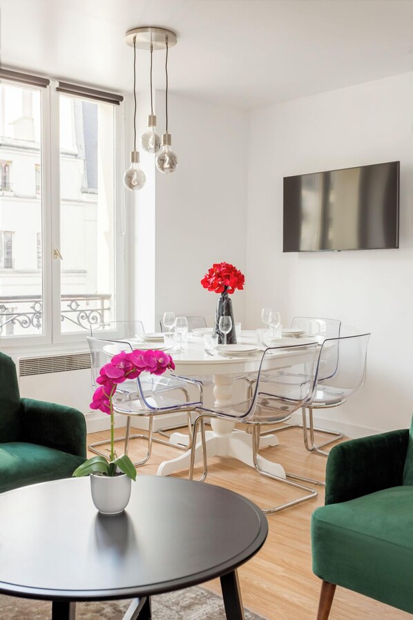 Ideally located in the heart of a lively Parisian neighborhood, the apartment offers easy access to all the conveniences such as French restaurants, bakeries, and trendy boutiques. Step into a bright and cozy living room, with green tones, blending contemporary design with vintage accents. Decorative wallpaper and gilded mirrors add a touch of charm, while velvet armchairs provide a feel-at-home atmosphere. The apartment is fully equipped for modern living, featuring a functional layout.