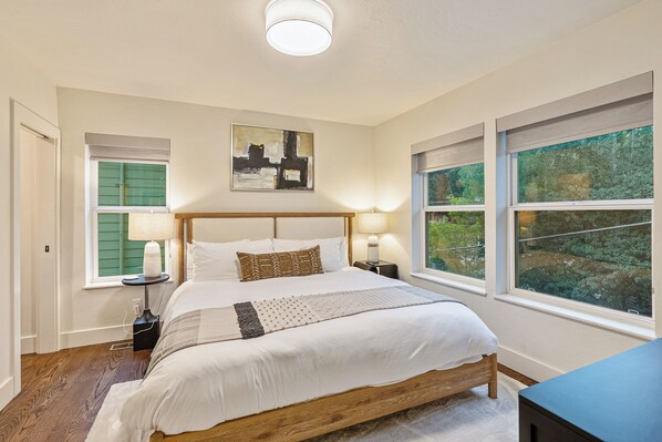 - A second-floor bedroom with a king-sized bed, an en suite bathroom, and a 40-inch flatscreen TV