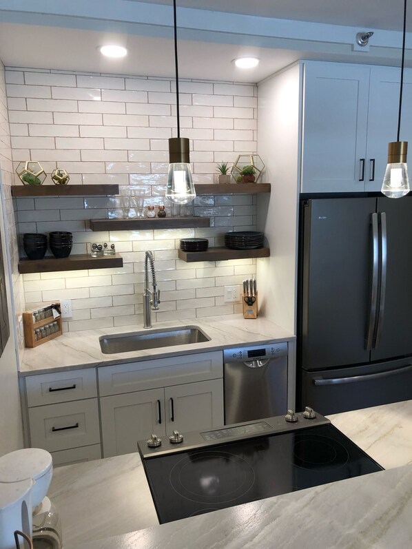 The beautifully renovated and fully stocked kitchen, equipped with a full size stove with oven, refrigerator, dishwasher, microwave, and all the necessary appliances which allows you to whip up delicious meals, while the breakfast bar provides the perfect setting for shared meals and conversations. Refresh yourself in the two bathrooms, stocked with towels and basic soaps, and enjoy the convenience of the in-unit washer and dryer.