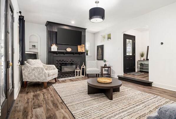 TV, fireplace, books - Suburban Sanctuary: 3BD Perfect for Long Stays (Pekin)
