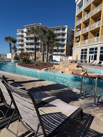 Guests enjoy the beachfront lazy river and on-site golfing at this coastal retreat, where both indoor and outdoor pools await after a day in the sun