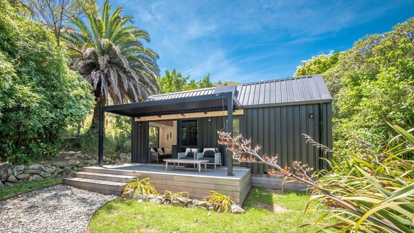 Experience tiny house living on picturesque Pepin Island at Kawakawa Cottage. Located near Nelson, this cozy getaway has a bedroom, loft, bathroom, kitchen and outdoor deck with BBQ. Unwind in nature with modern conveniences like electricity and great cell reception.