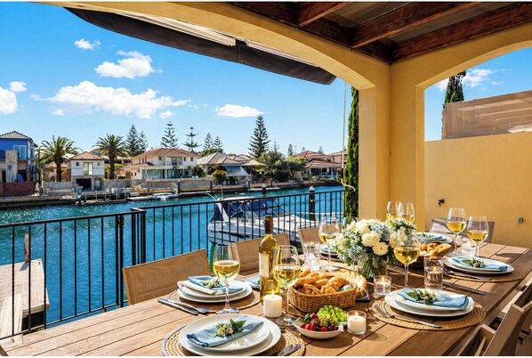 North-facing and filled with natural light, the home opens onto an alfresco dining area overlooking the canal, creating an easy indoor–outdoor flow that guests love.