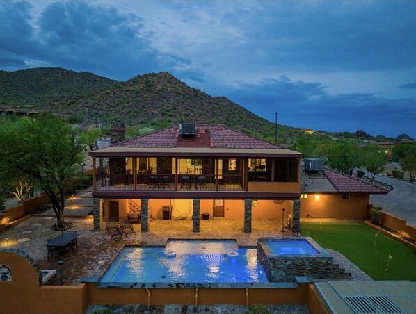 Nestled in Mesa, this luxury villa offers a serene escape with modern comforts. Wake up to the majestic views of the AZ mountain range, then unwind by the private pool or rejuvenate at the spa. With spacious living and dining areas, a mini-golf course, and BBQ facilities available.