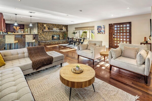 • Primary Bedroom: A serene escape with a King bed, Smart TV, and direct access to the backyard