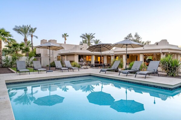 Ultimate Compound offers an unforgettable luxury getaway with designer-inspired interiors and exquisite outdoor amenities. Enjoy a spacious Great Room, Chef’s Kitchen, and dining areas perfect for large groups or family reunions. Relax in the heated pool with water feature, unwind by the fireplace or fire pit area.