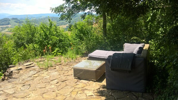 Also from the village surrounded the houses mosaic pool, you have a magnificent view of the valley of Foglia and the surrounding hills of Montefeltro to the peaks of the Alpe della Luna. Around the pool there are several sun terraces and - in the surrounding houses gardens - several furnished spaces.