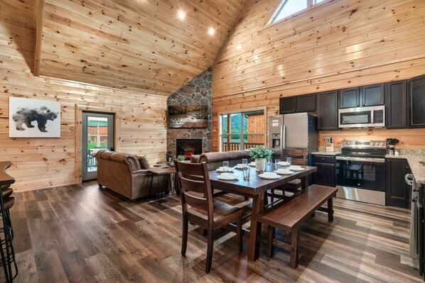 A dining table with 2 chairs and 2 benches in the kitchen can fit 8 people. There is also a table behind the sofa that can fit three additional people and a similar table in the loft for three people. The open dining area and a fully equipped kitchen provide for wonderful space for family gatherings. Appliances, pots, pans, cups, plates, utensils, drip/pod Keurig coffee maker.